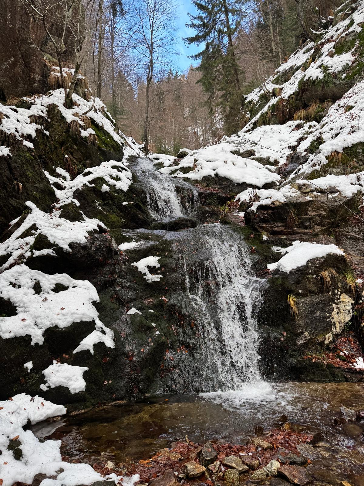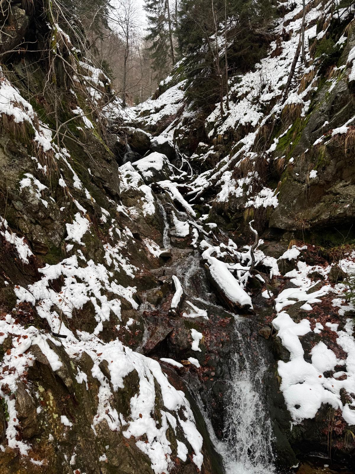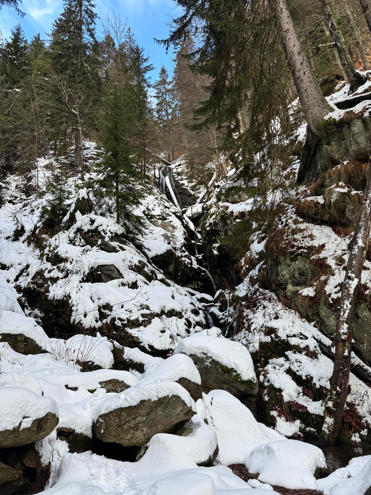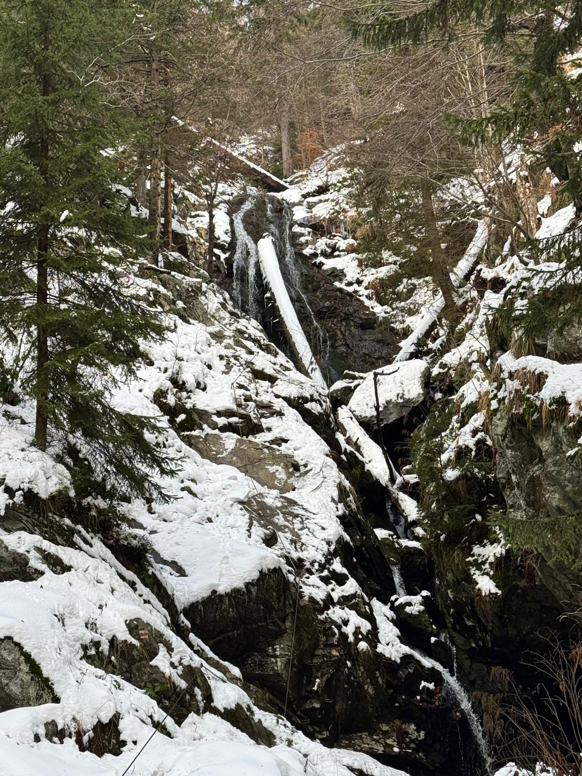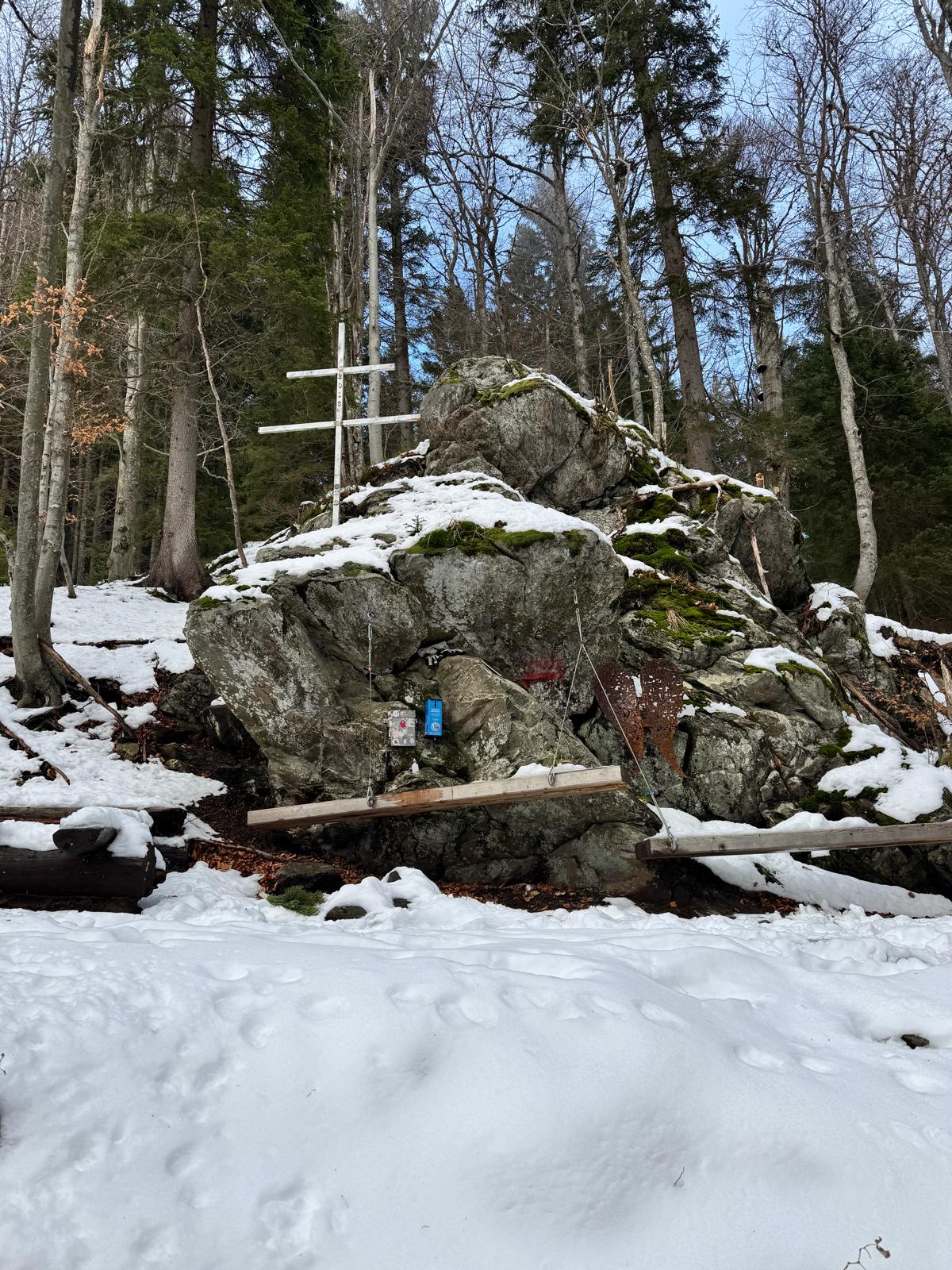 Pod vodopádmi sa môžete rozhodnúť, či pokračujete ďalej úsekom C alebo B (neskôr sa obidve cesty opäť spájajú). Ja sa rozhodnem pre B, „céčko“ sa mi zdá až moc zasnežené. Ešte 200 metrov dlhý úsek a stojím na malom mostíku nad potokom. Tu už môžete výstroj dať dole. Po turistickom chodníku došľapete ku krížu, kde si môžete oddýchnuť (je tu posedenie) a aj výstupová kniha.