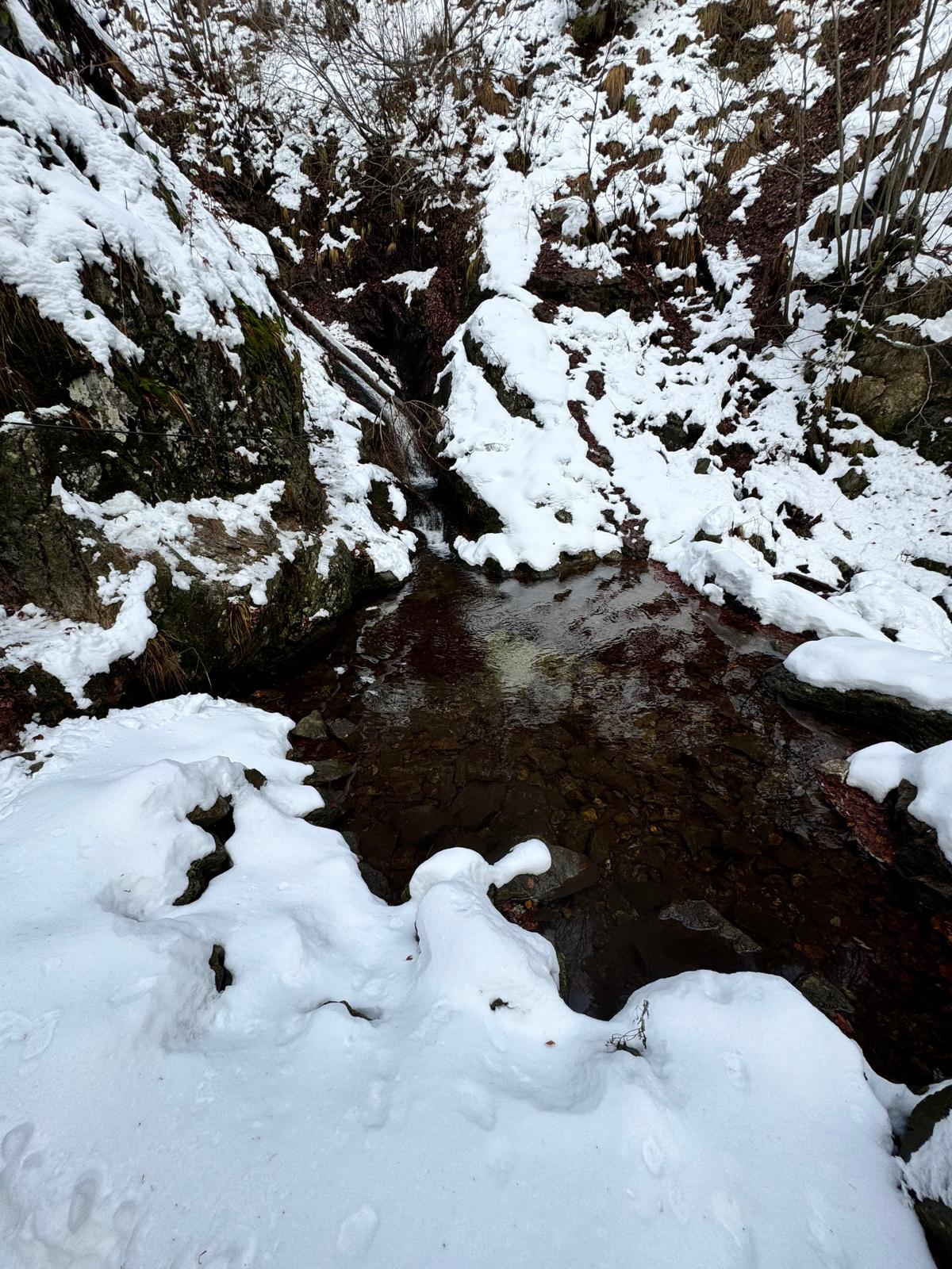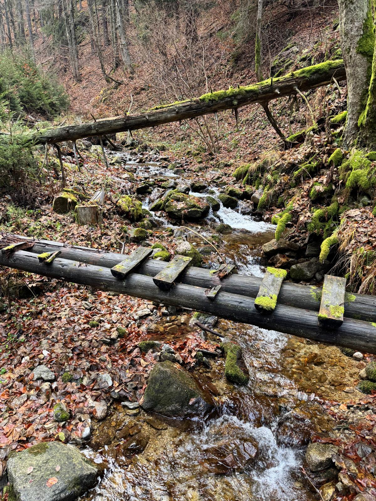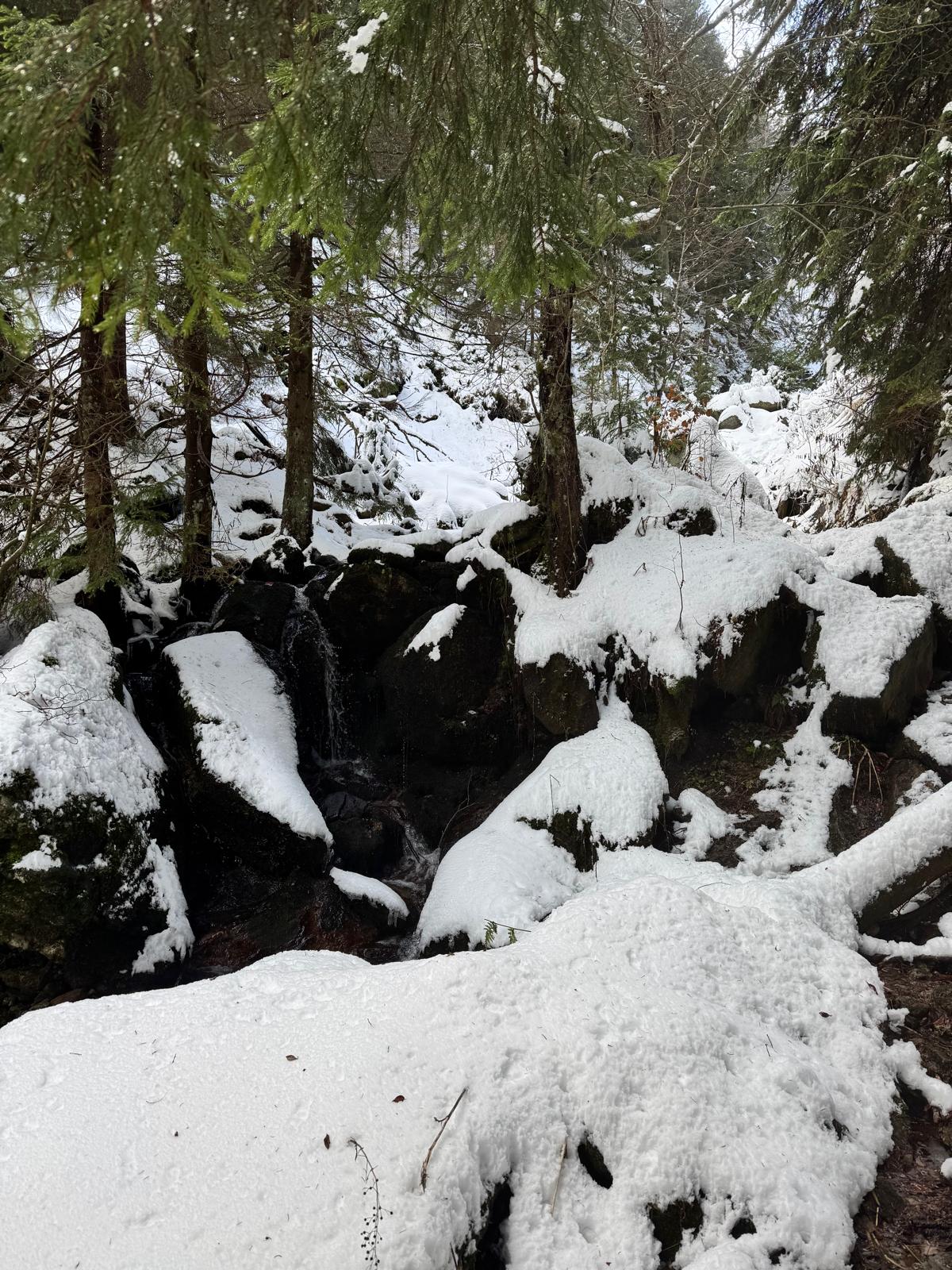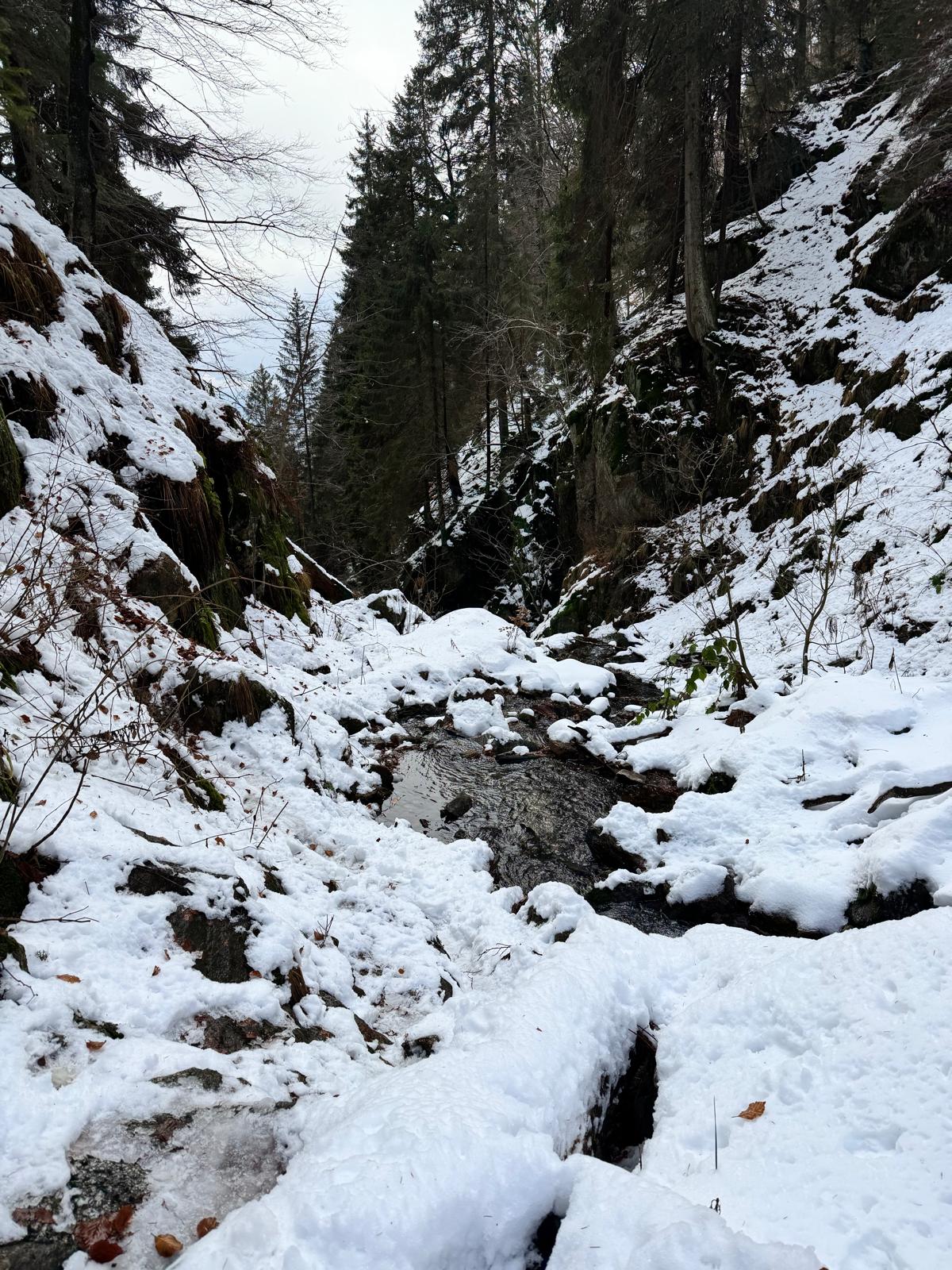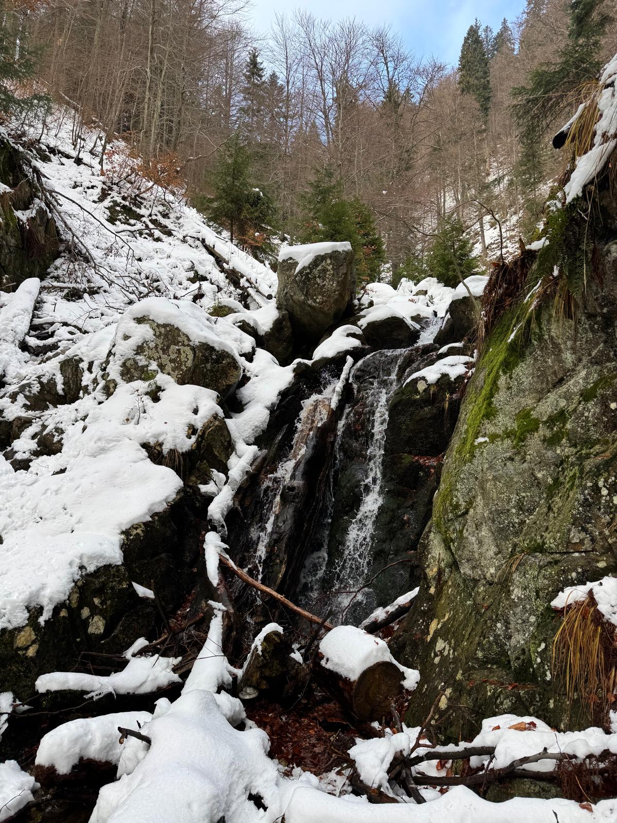 Pod vodopádmi sa môžete rozhodnúť, či pokračujete ďalej úsekom C alebo B (neskôr sa obidve cesty opäť spájajú). Ja sa rozhodnem pre B, „céčko“ sa mi zdá až moc zasnežené. Ešte 200 metrov dlhý úsek a stojím na malom mostíku nad potokom. Tu už môžete výstroj dať dole. Po turistickom chodníku došľapete ku krížu, kde si môžete oddýchnuť (je tu posedenie) a aj výstupová kniha.