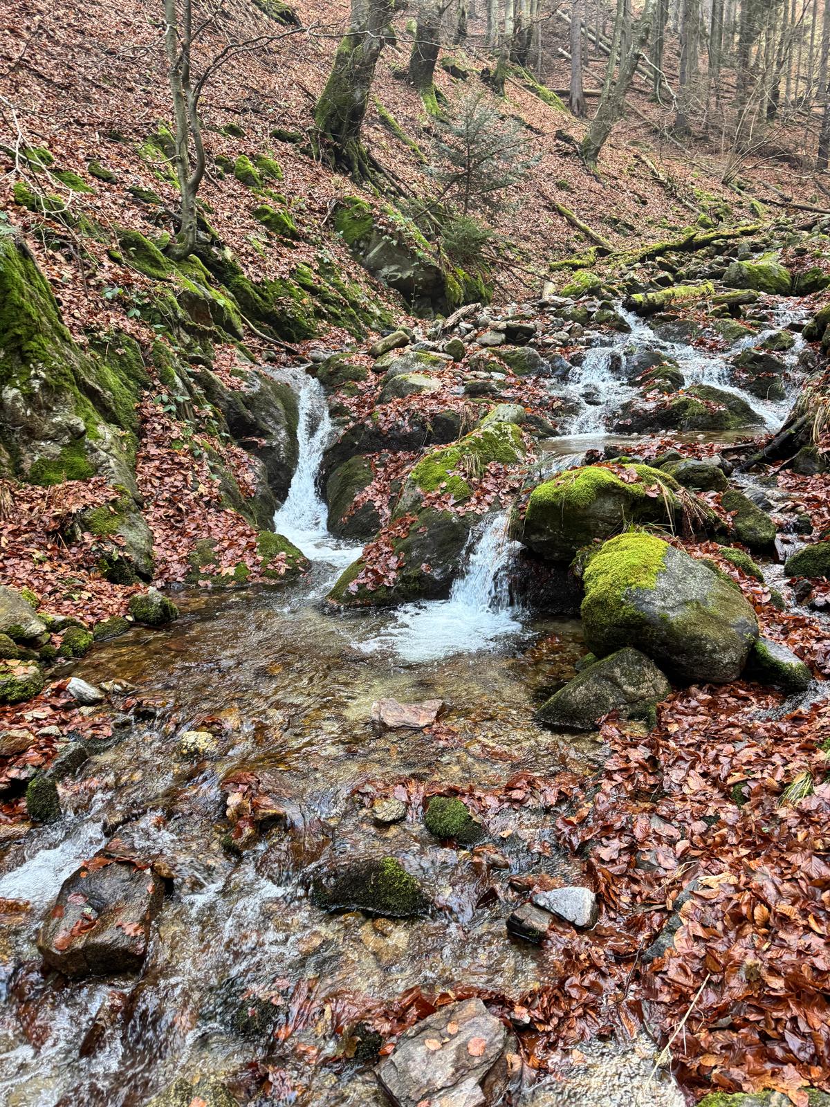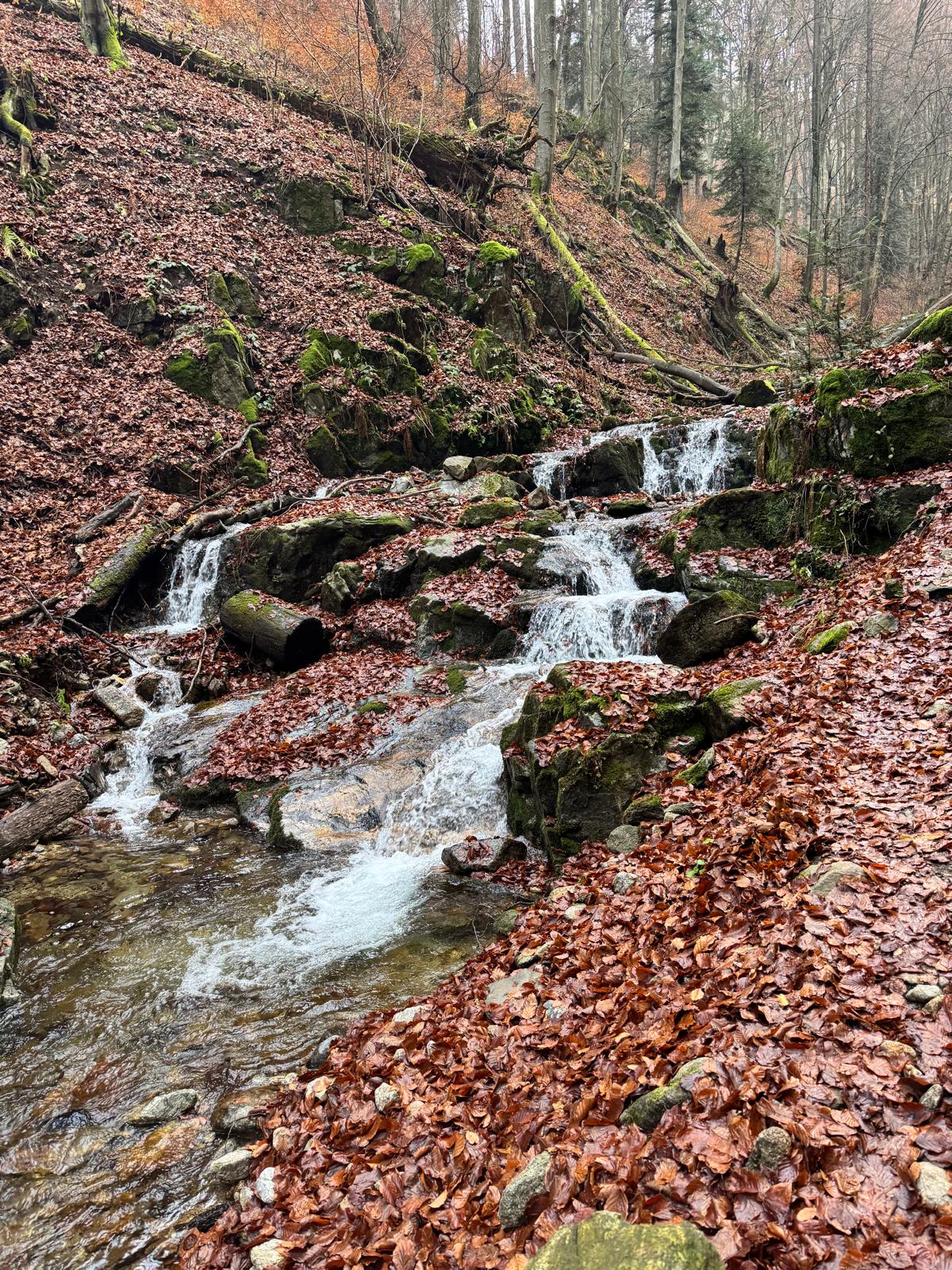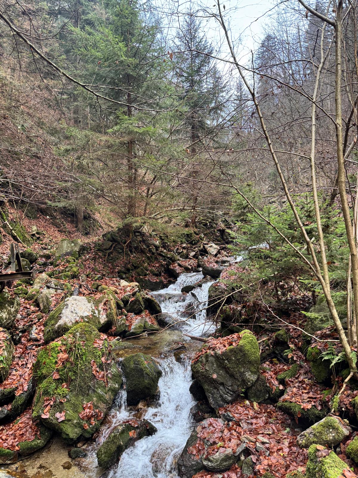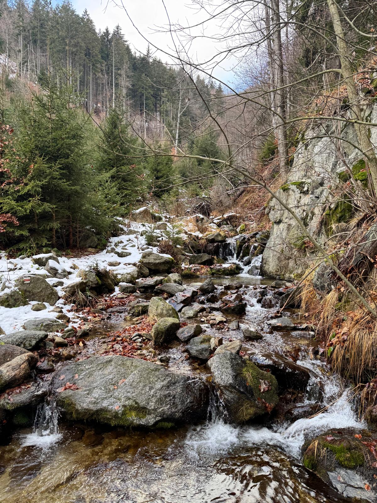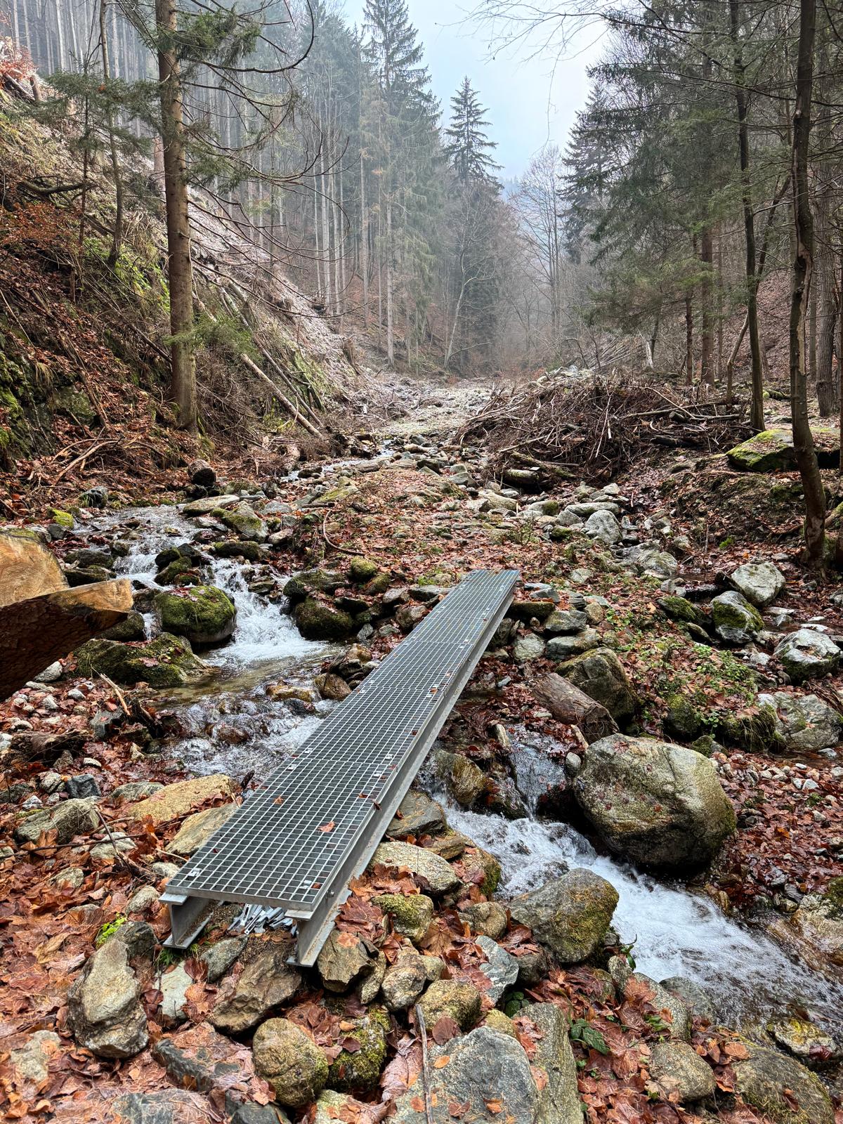 Pod vodopádmi sa môžete rozhodnúť, či pokračujete ďalej úsekom C alebo B (neskôr sa obidve cesty opäť spájajú). Ja sa rozhodnem pre B, „céčko“ sa mi zdá až moc zasnežené. Ešte 200 metrov dlhý úsek a stojím na malom mostíku nad potokom. Tu už môžete výstroj dať dole. Po turistickom chodníku došľapete ku krížu, kde si môžete oddýchnuť (je tu posedenie) a aj výstupová kniha.