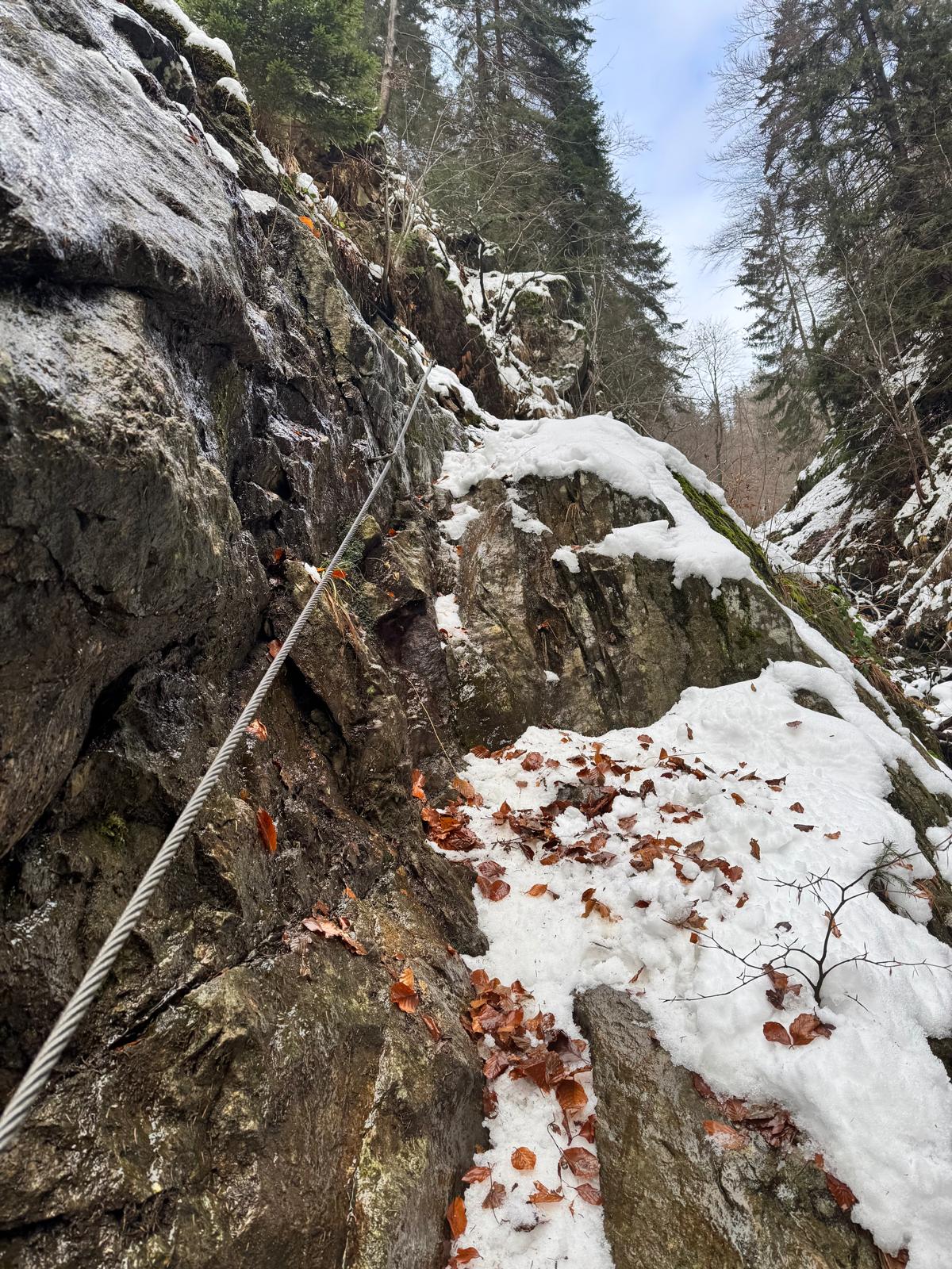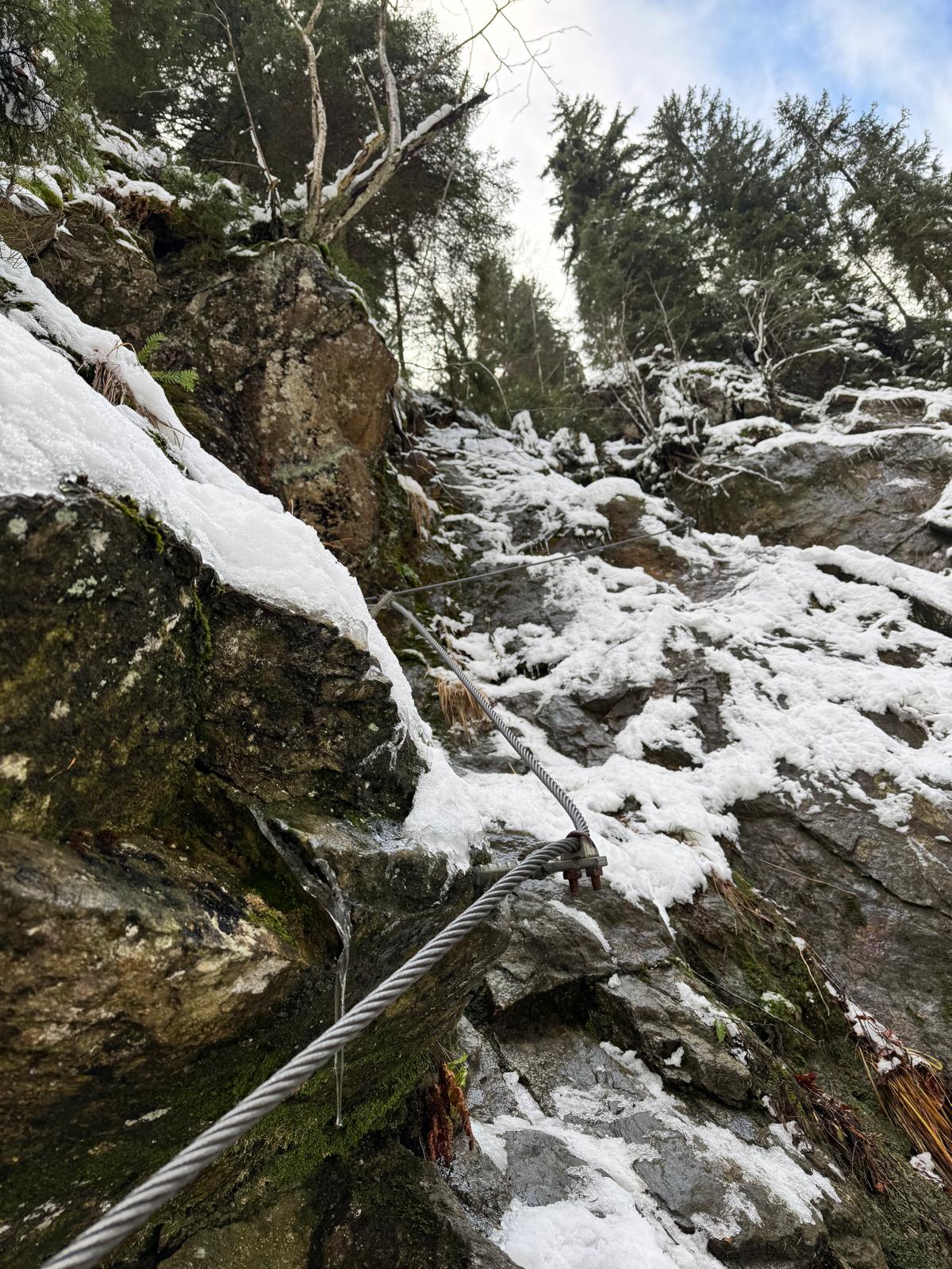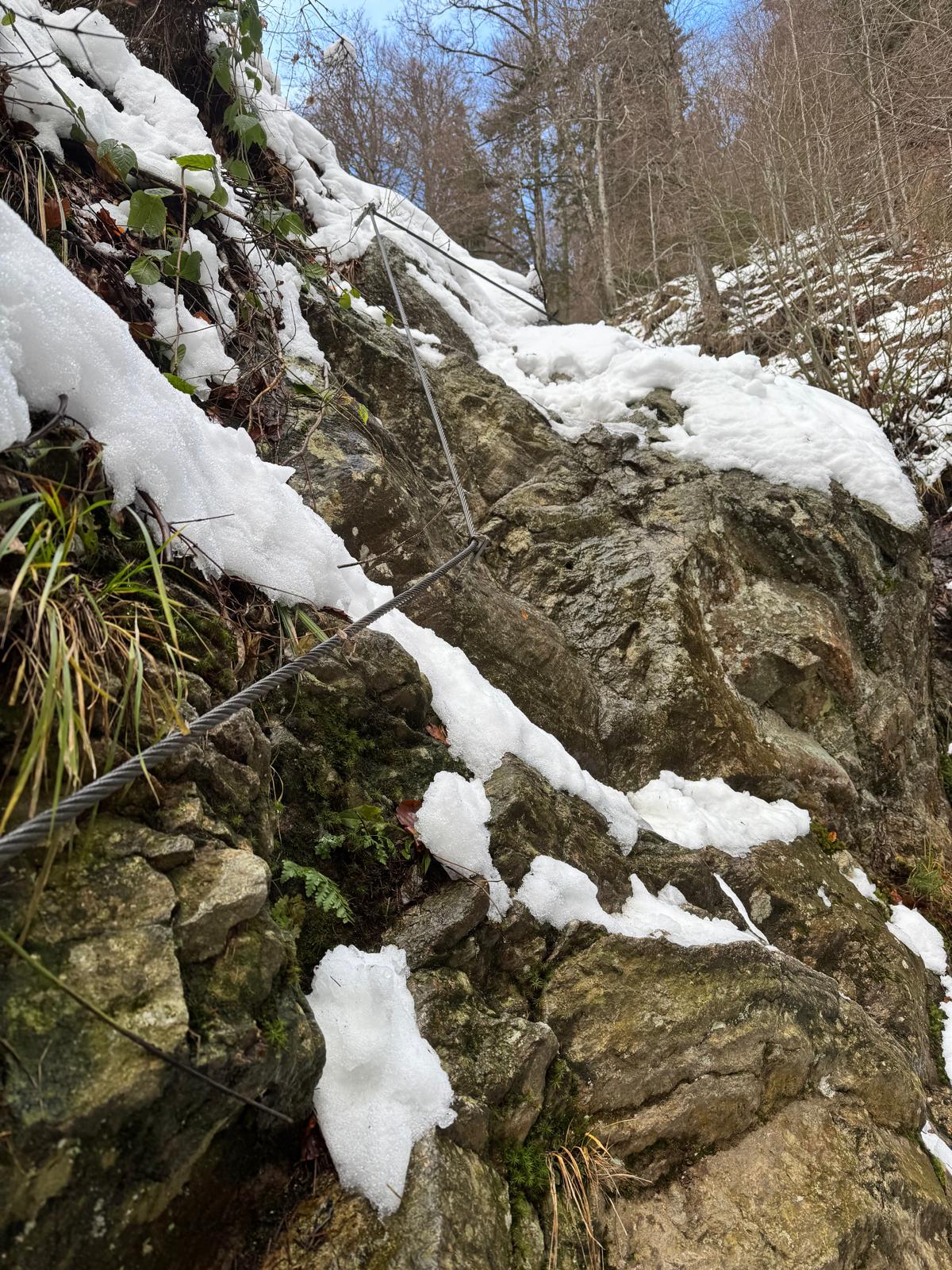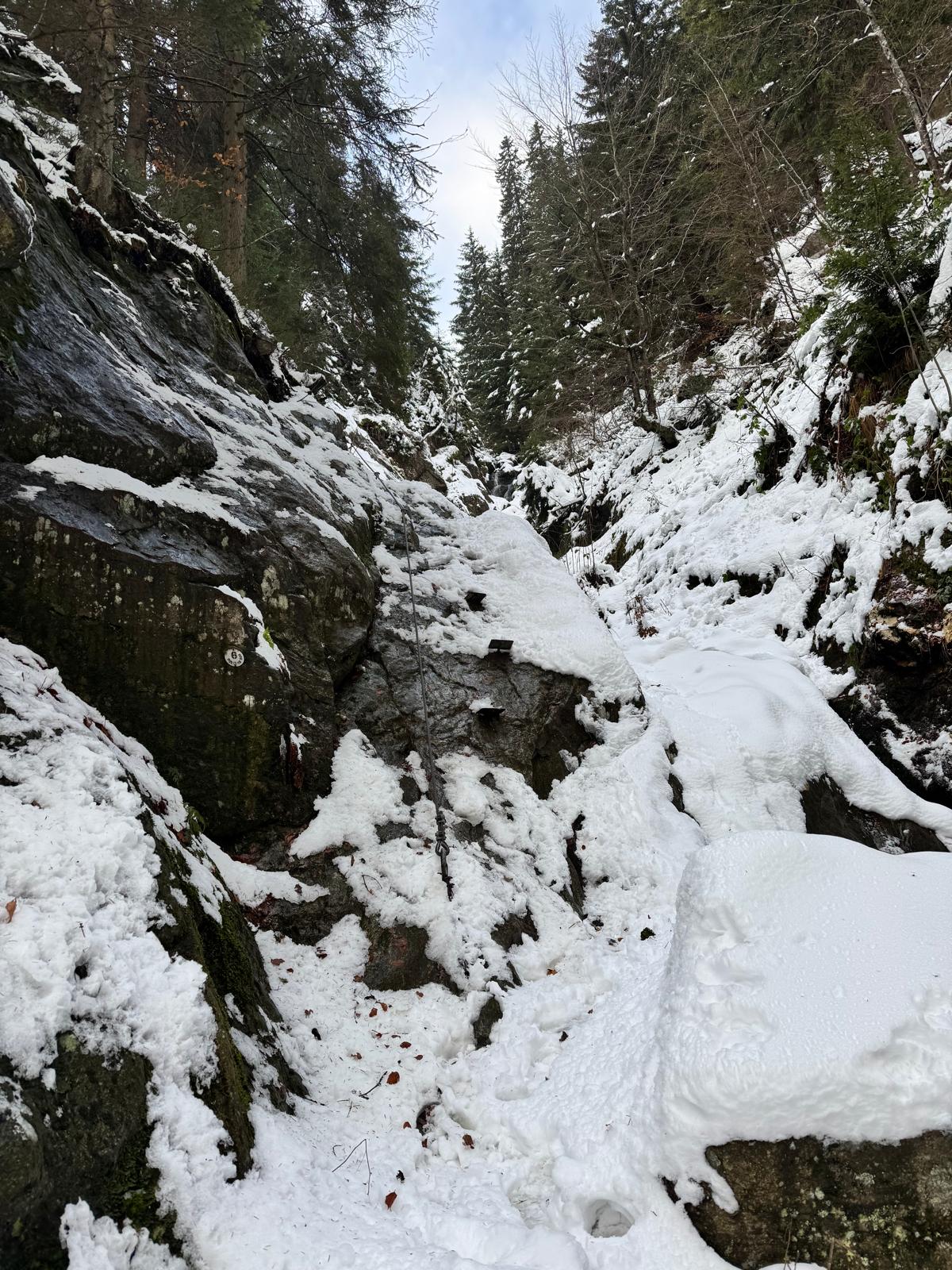 Na začiatku ferraty je postavené posedenie, kde už je vhodné navliecť si výstroj. Trasa je v zime o dosť nebezpečnejšia, nechýba tu ľad, sneh a je tu aj celkom chladno ☺ . Preto je vhodné si brať aj mačky a cepín (ktorý som nemal). V mojom prípade bolo dokonca treba niekoľko krát aj hľadať lano, keďže snehu a vody tu bolo naozaj dosť.