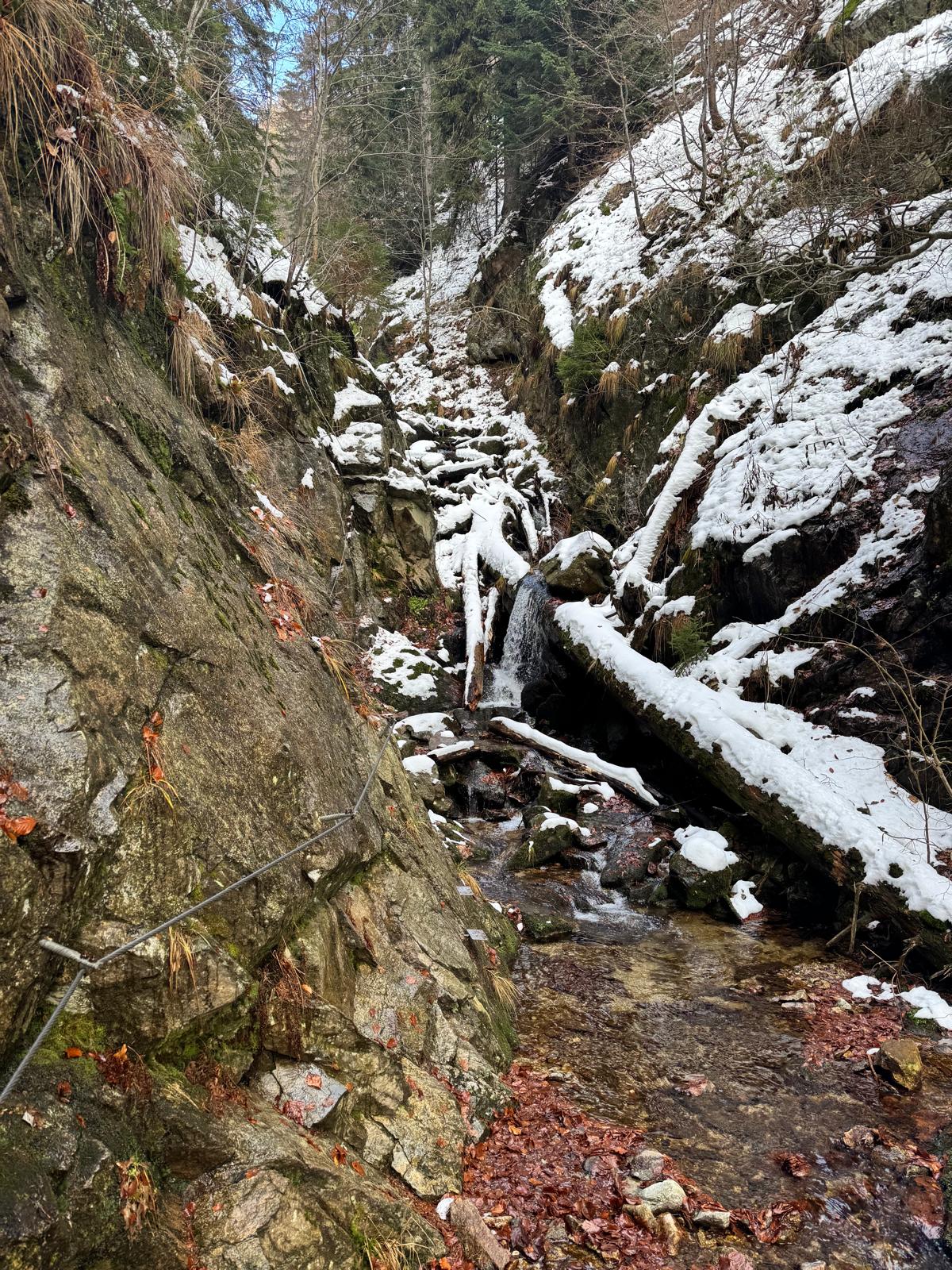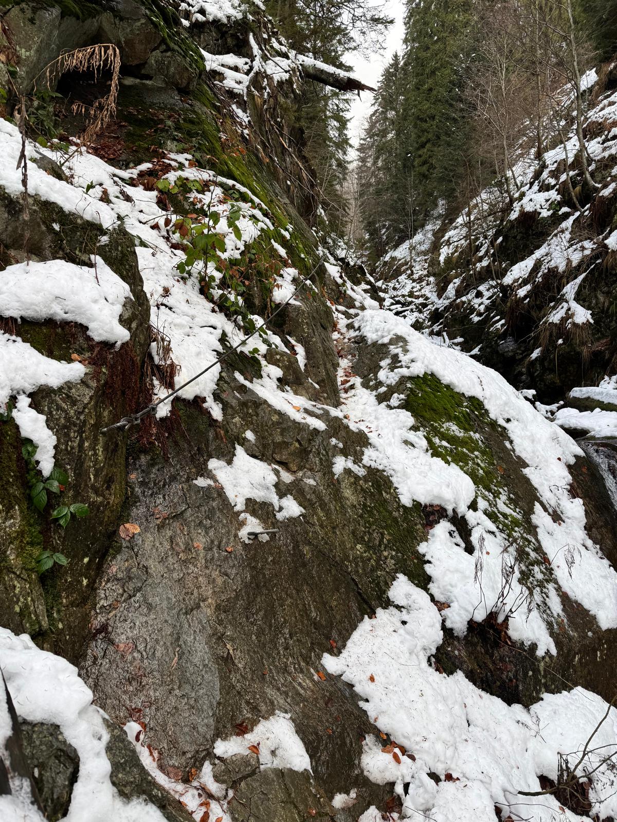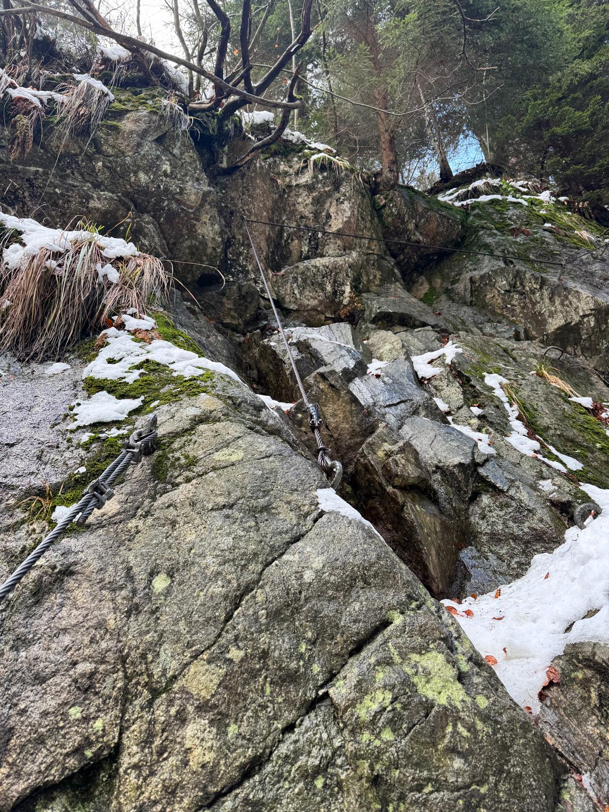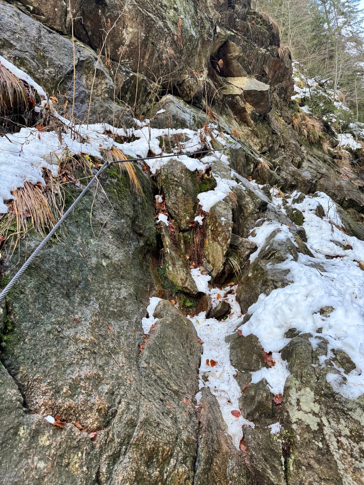 Na začiatku ferraty je postavené posedenie, kde už je vhodné navliecť si výstroj. Trasa je v zime o dosť nebezpečnejšia, nechýba tu ľad, sneh a je tu aj celkom chladno ☺ . Preto je vhodné si brať aj mačky a cepín (ktorý som nemal). V mojom prípade bolo dokonca treba niekoľko krát aj hľadať lano, keďže snehu a vody tu bolo naozaj dosť.