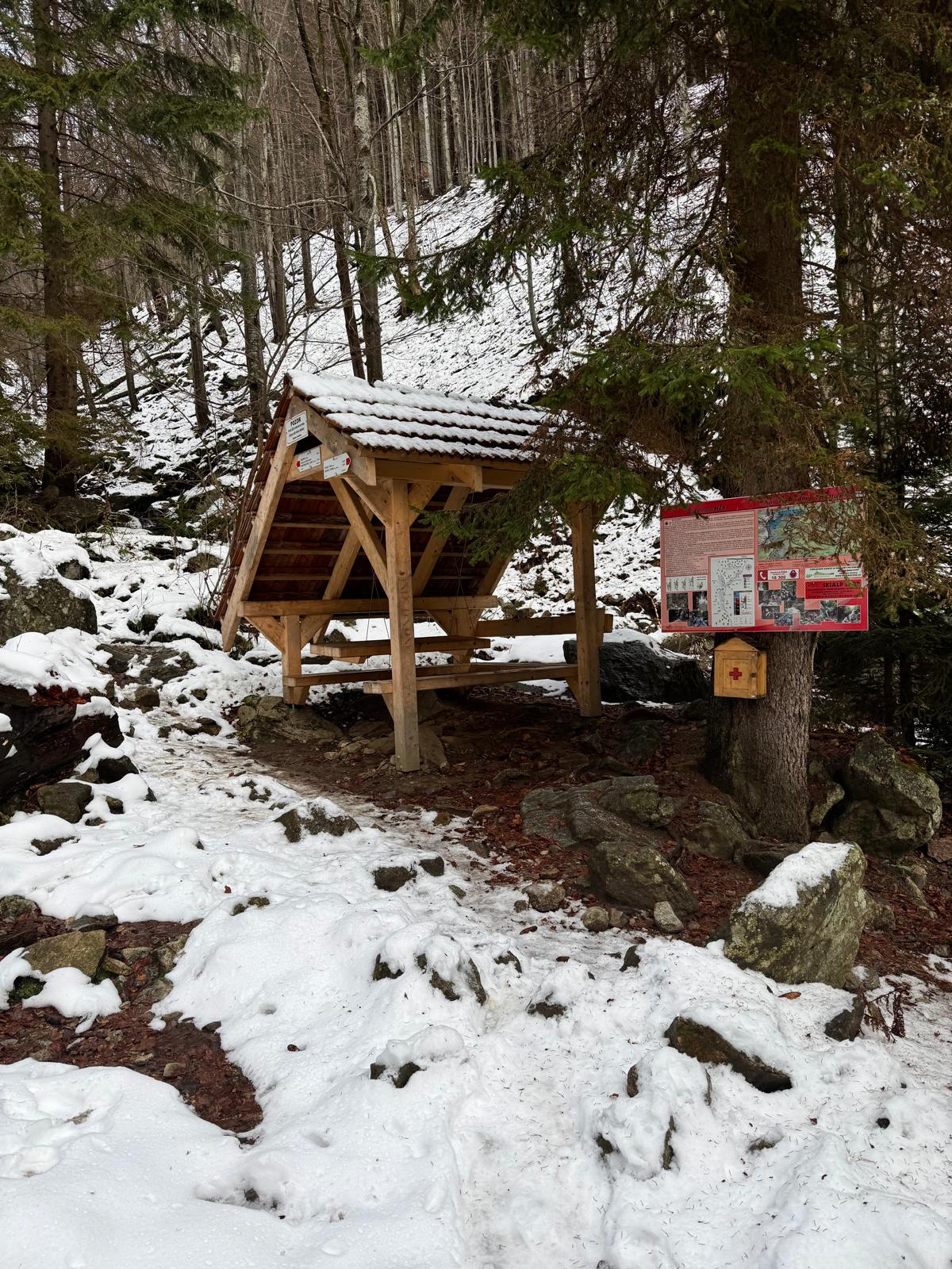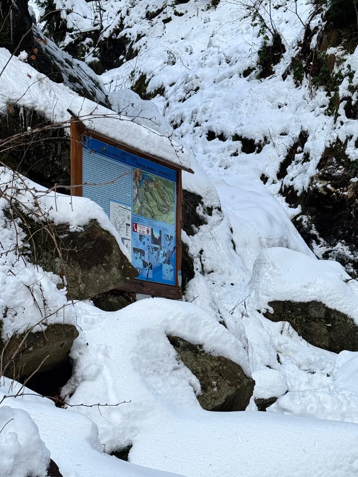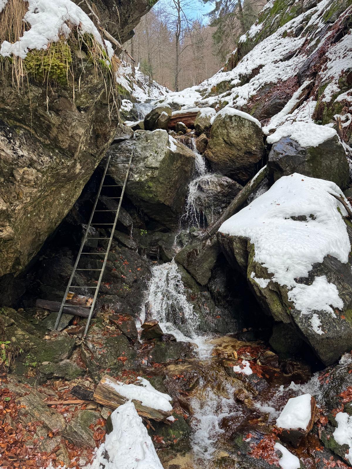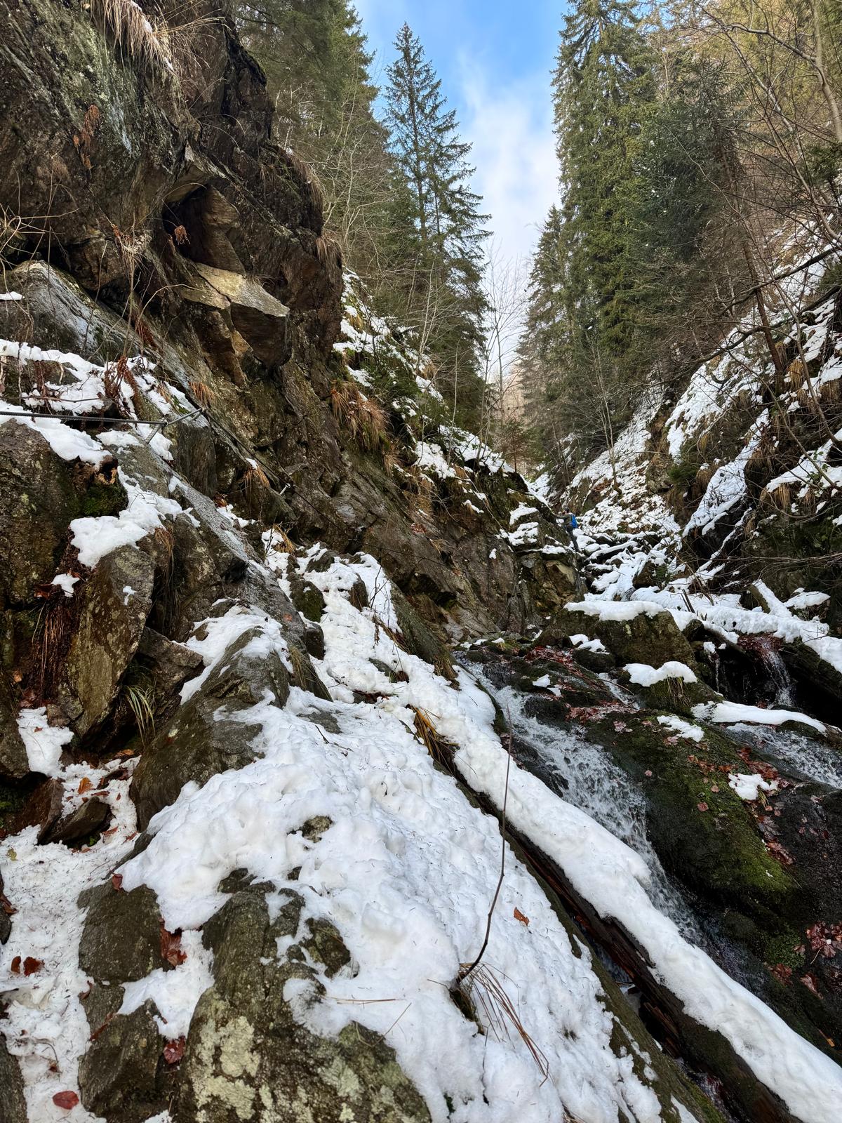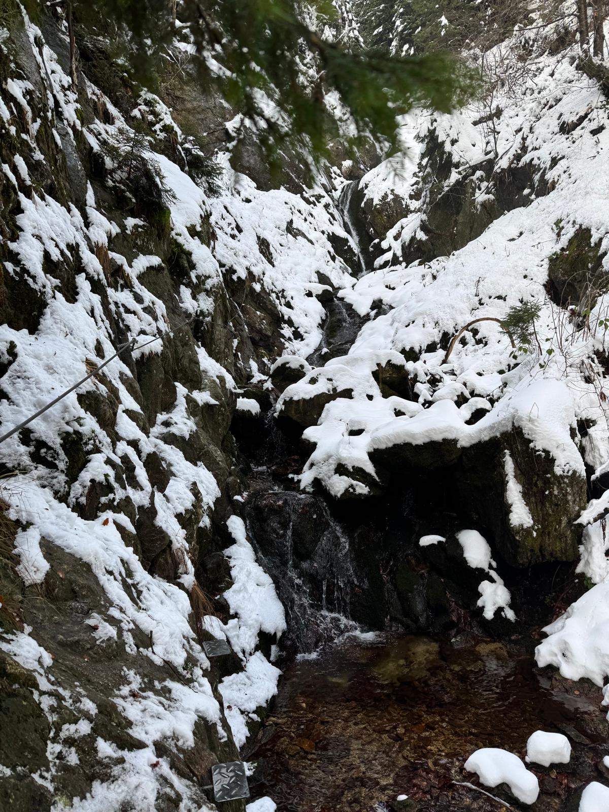 Na začiatku ferraty je postavené posedenie, kde už je vhodné navliecť si výstroj. Trasa je v zime o dosť nebezpečnejšia, nechýba tu ľad, sneh a je tu aj celkom chladno ☺ . Preto je vhodné si brať aj mačky a cepín (ktorý som nemal). V mojom prípade bolo dokonca treba niekoľko krát aj hľadať lano, keďže snehu a vody tu bolo naozaj dosť.