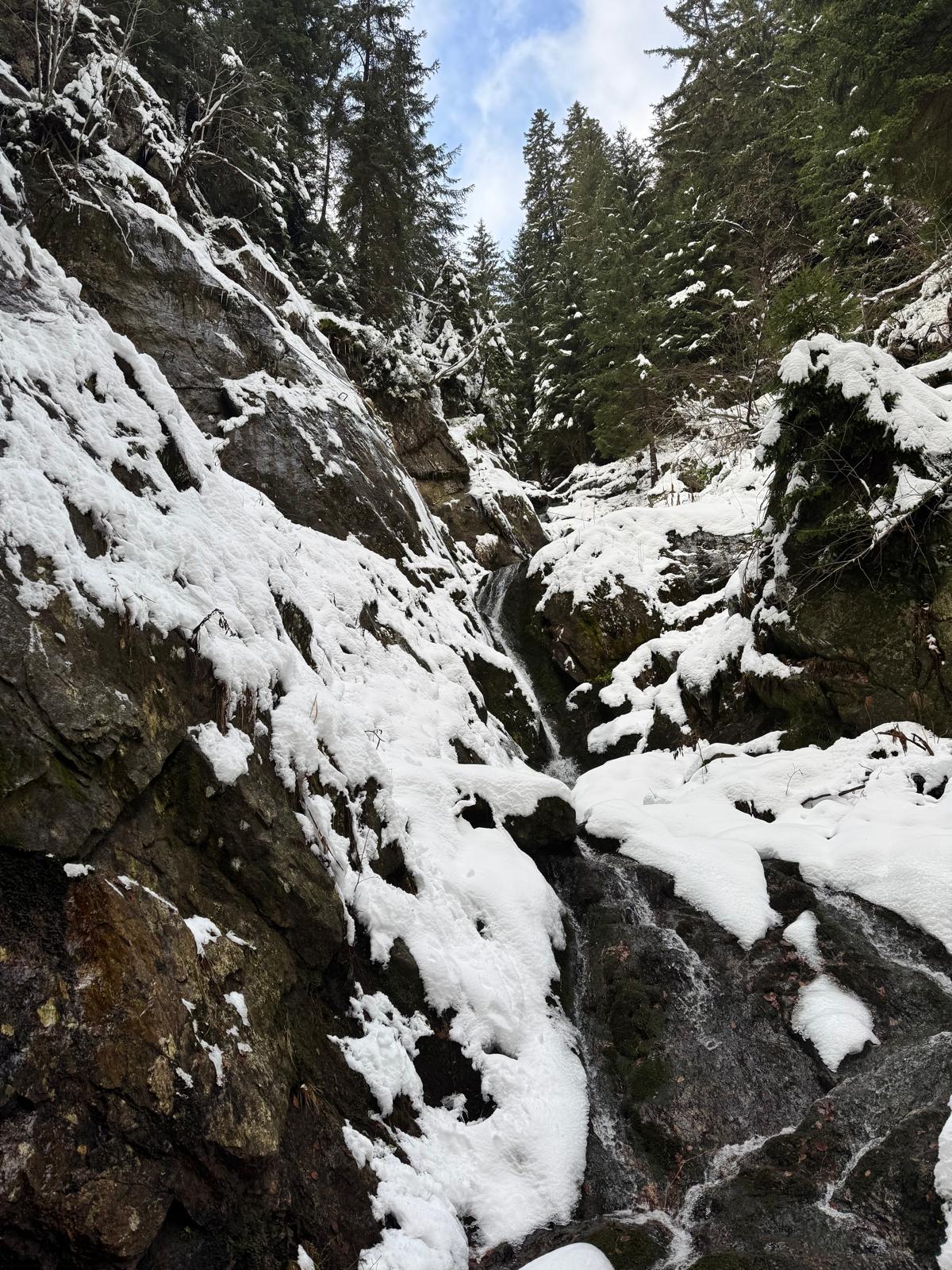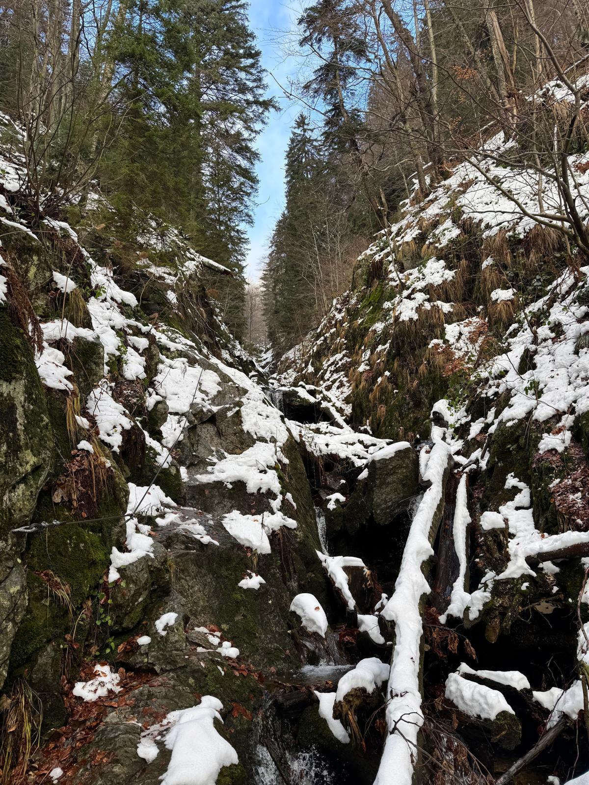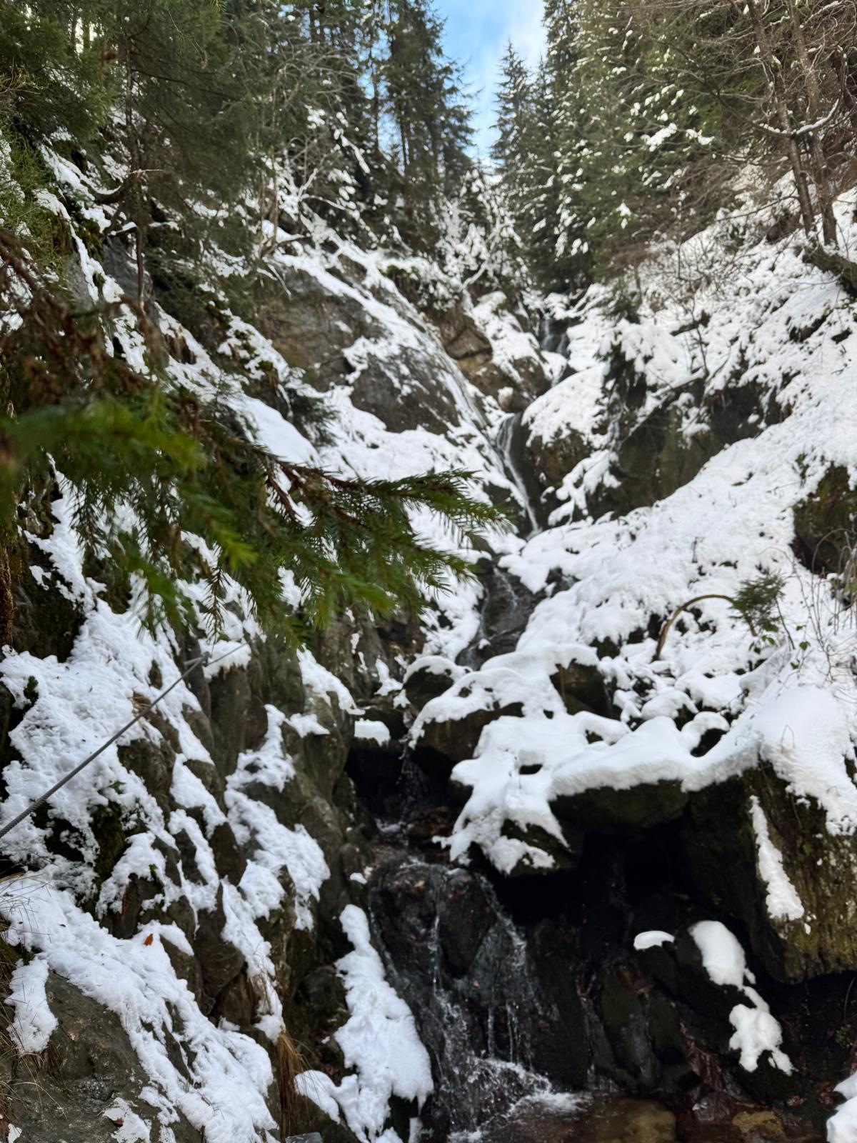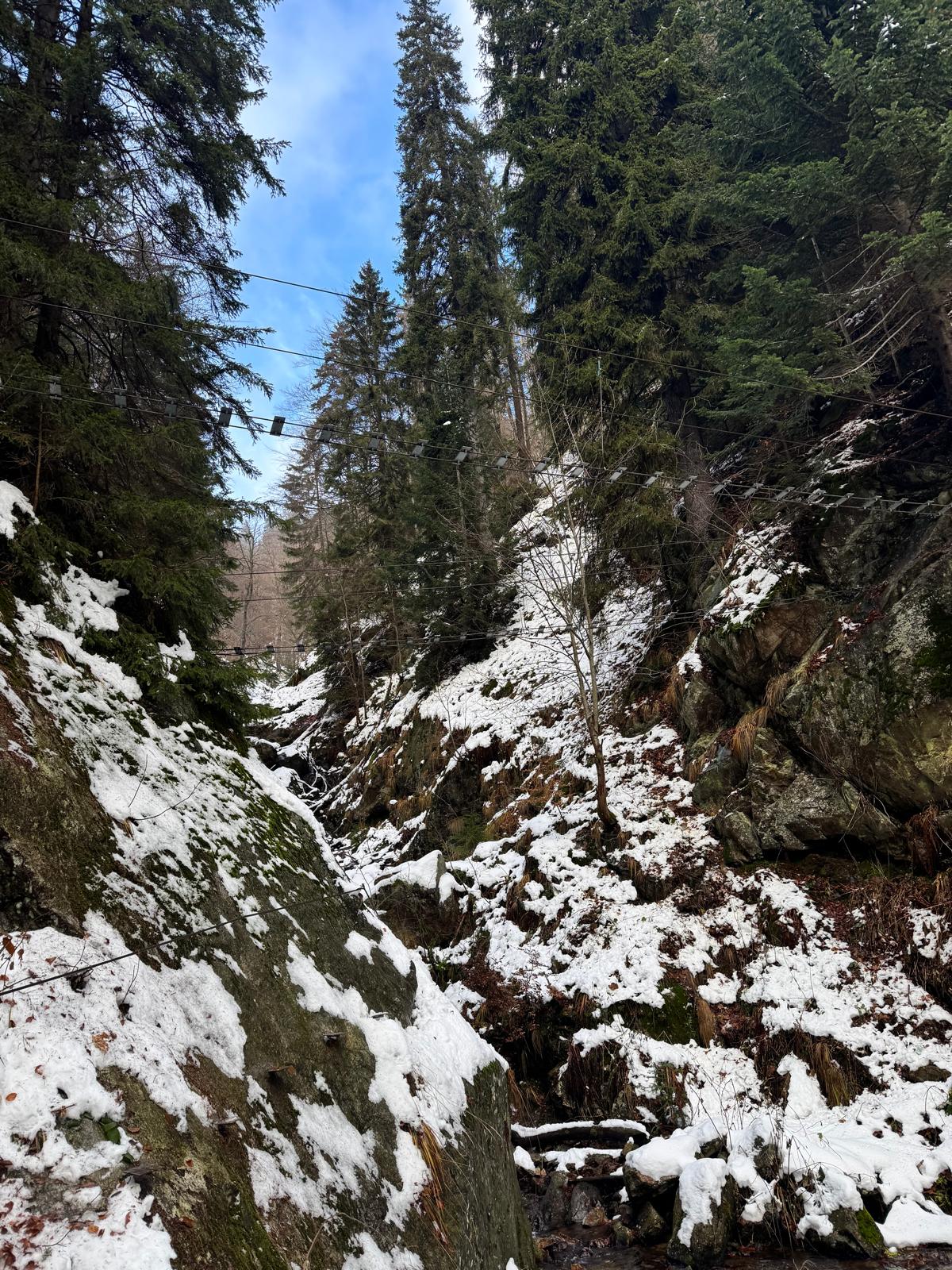 Na začiatku ferraty je postavené posedenie, kde už je vhodné navliecť si výstroj. Trasa je v zime o dosť nebezpečnejšia, nechýba tu ľad, sneh a je tu aj celkom chladno ☺ . Preto je vhodné si brať aj mačky a cepín (ktorý som nemal). V mojom prípade bolo dokonca treba niekoľko krát aj hľadať lano, keďže snehu a vody tu bolo naozaj dosť.