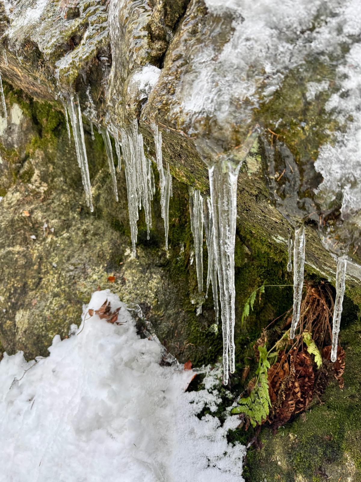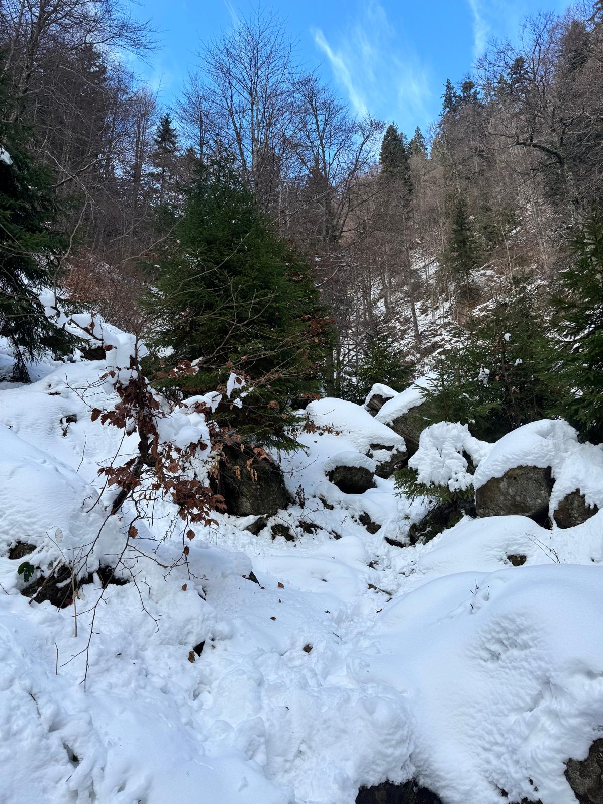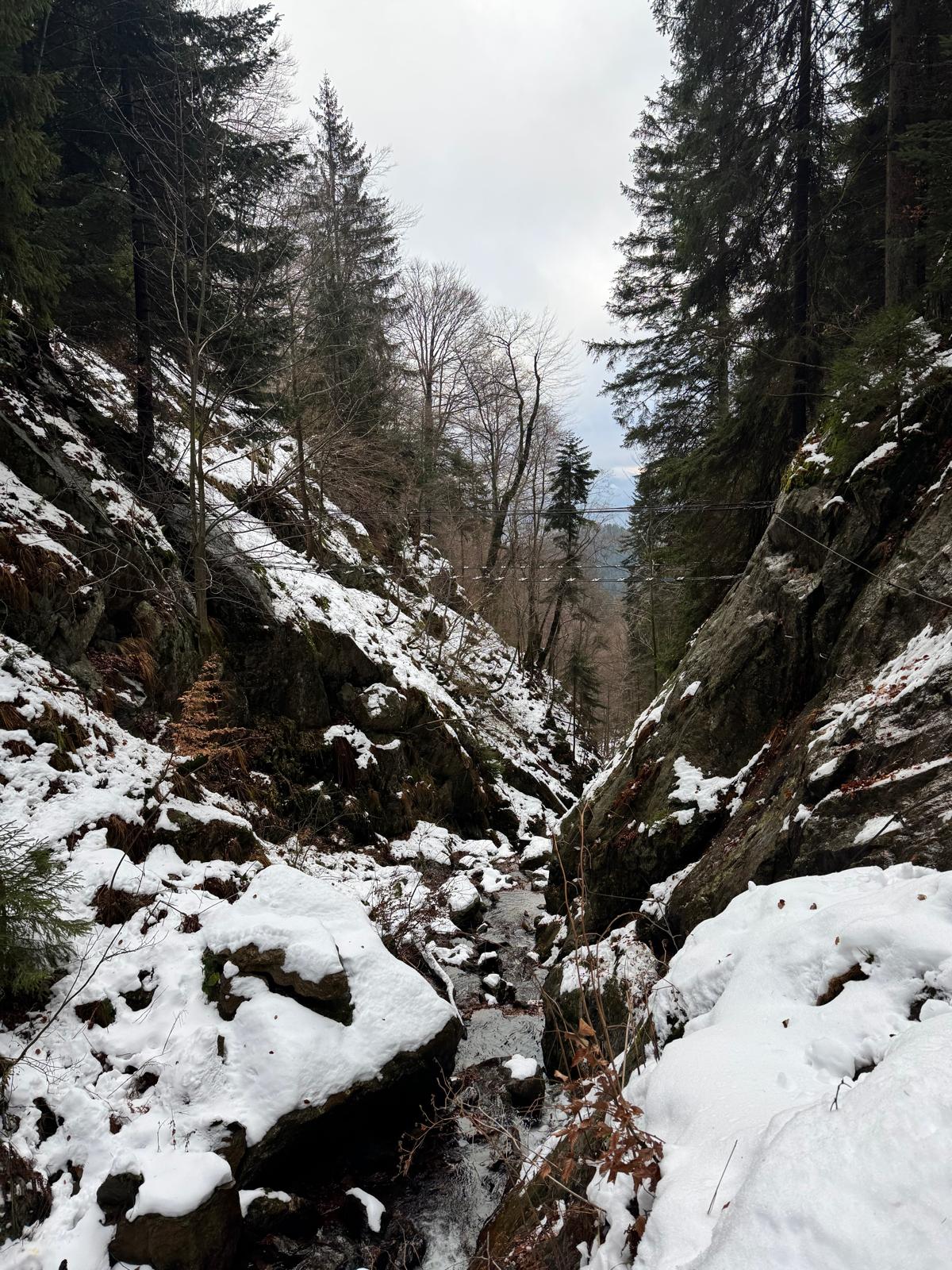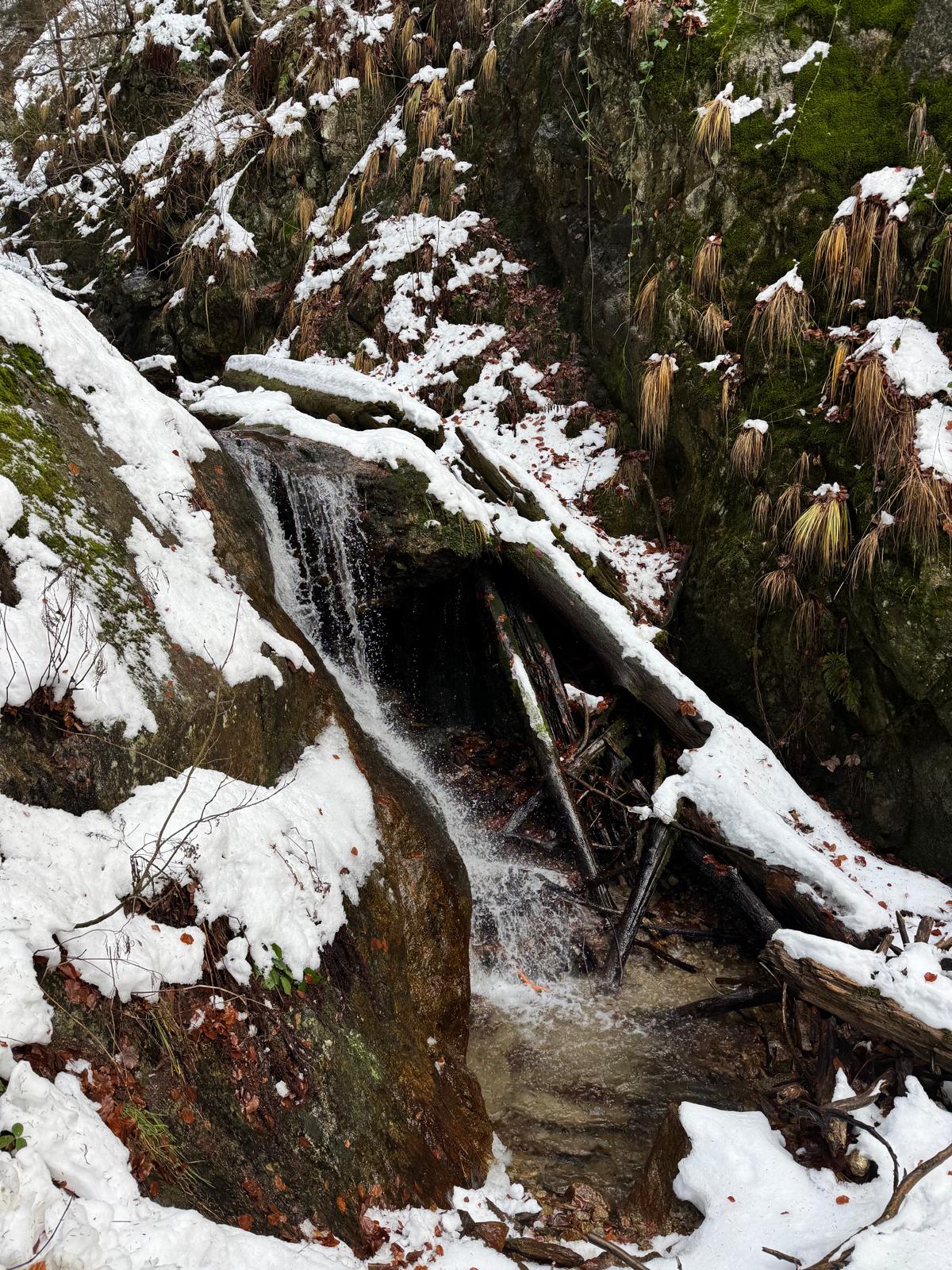 Na začiatku ferraty je postavené posedenie, kde už je vhodné navliecť si výstroj. Trasa je v zime o dosť nebezpečnejšia, nechýba tu ľad, sneh a je tu aj celkom chladno ☺ . Preto je vhodné si brať aj mačky a cepín (ktorý som nemal). V mojom prípade bolo dokonca treba niekoľko krát aj hľadať lano, keďže snehu a vody tu bolo naozaj dosť.