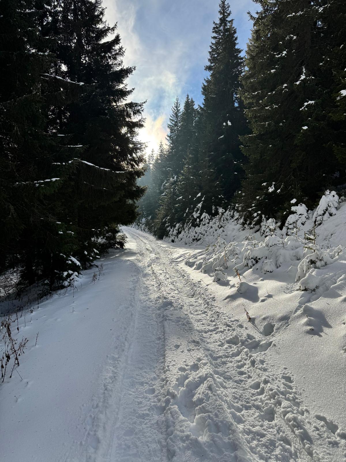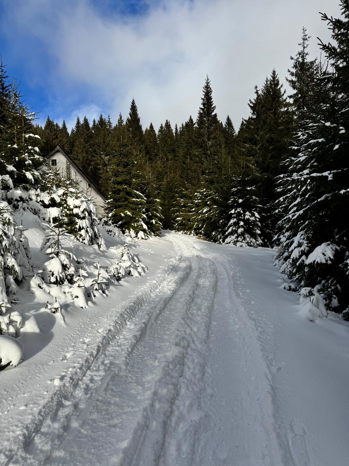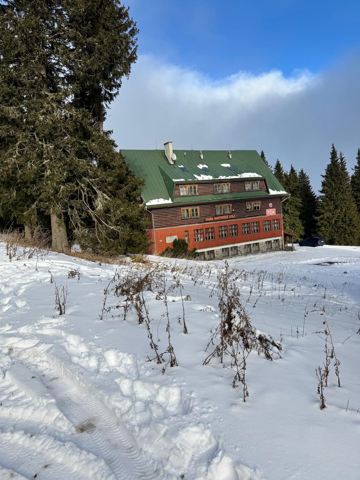 Ešte 400 metrov po červenej značke lesíkom a stojím na ceste, ktorá spája Bystričku s rekreačnou oblasťou Martinské hole vo výške 1 250 metrov (modrá turistická značka). Cesta je nádherne zasnežená a slniečko svieti. Ani nie za 15 minút som v centre chatovej osady, kde si dám v reštaurácii výdatný obed v podobe segedínskeho gulášu a piva ☺ .