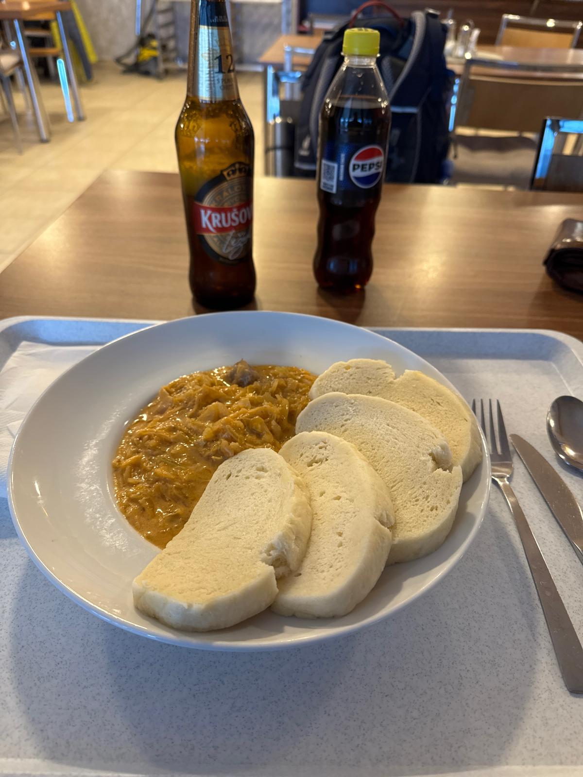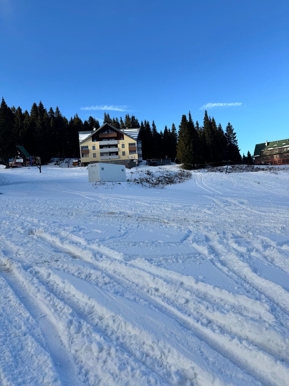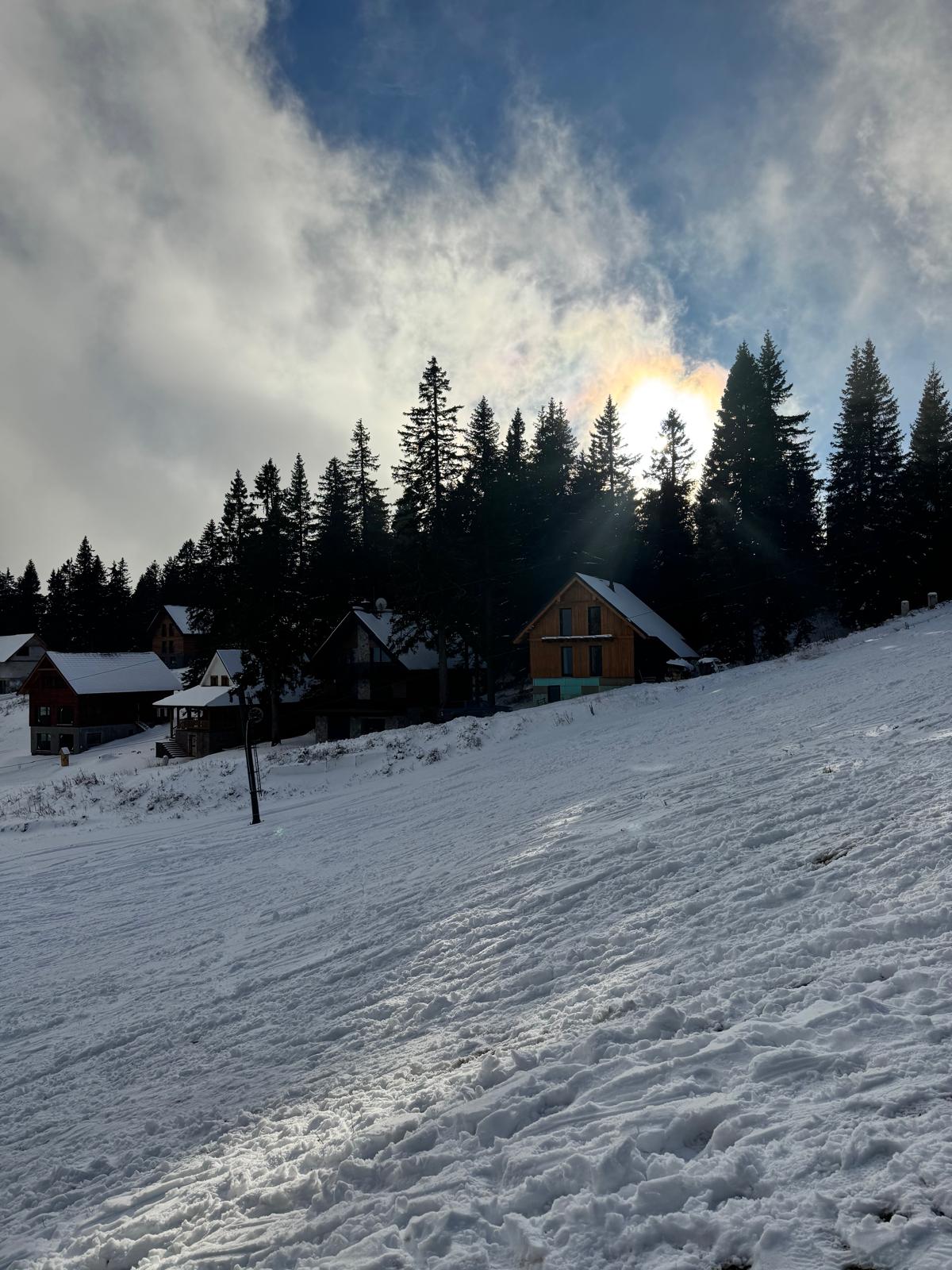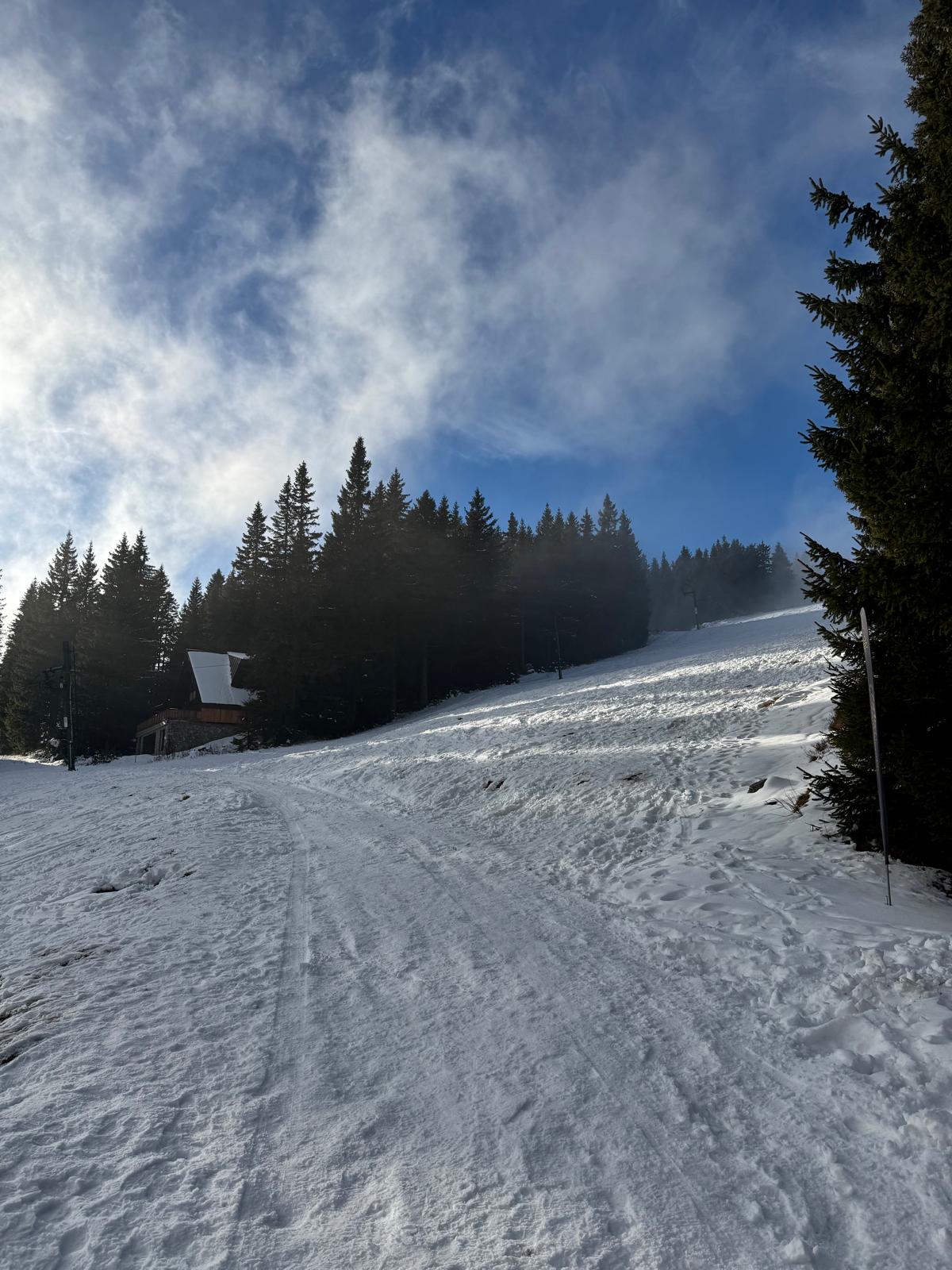 Ešte 400 metrov po červenej značke lesíkom a stojím na ceste, ktorá spája Bystričku s rekreačnou oblasťou Martinské hole vo výške 1 250 metrov (modrá turistická značka). Cesta je nádherne zasnežená a slniečko svieti. Ani nie za 15 minút som v centre chatovej osady, kde si dám v reštaurácii výdatný obed v podobe segedínskeho gulášu a piva ☺ .